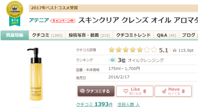 アテニアの中でも一番人気はクレンジングです。@コスメの口コミ数は約1400件ありますし、2017年のベストコスメ受賞してます。また今までオイルクレンジングで何度も1位を獲ってます。
