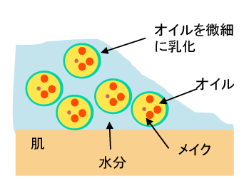 すすぎの水で、メイク汚れを絡めとったオイルがこまか~く微粒子レベルに分散・乳化することで、サラッとスッキリオイルを落とし汚れを取り除くことができます。